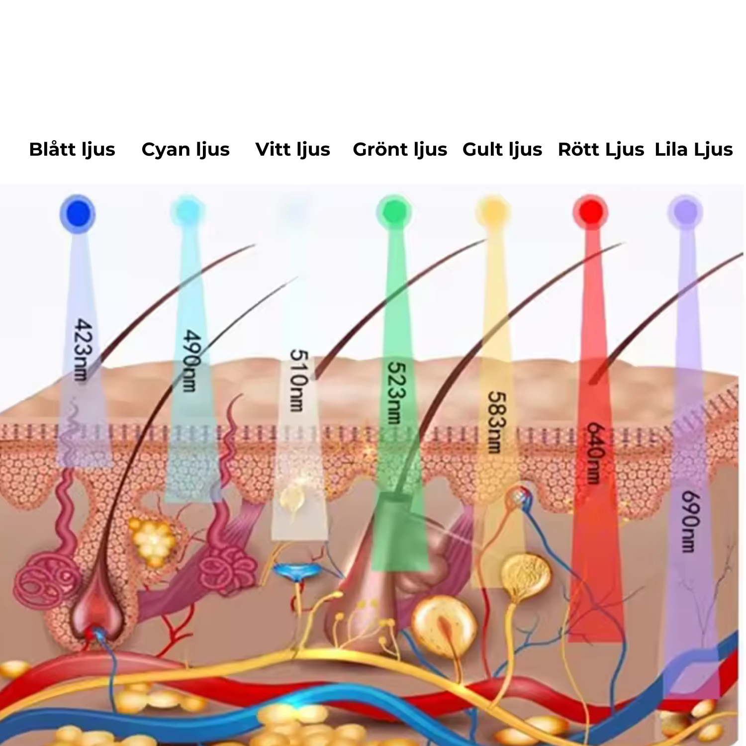6. Gul LED (583nm): Hjälper till att återställa hudens vitalitet och ger en friskare hudton. Jämnar ut hudton & minskar pigmentfläckar.